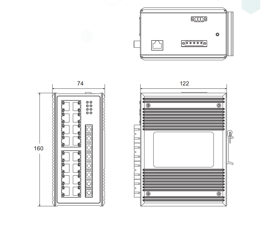 物理尺寸(高×宽×深):160mm×74 mm×122mm 安装方式:标准DIN卡轨式 散热形式:铝合金单肋形机箱表面散热,无风机 机壳防护:IP40 |