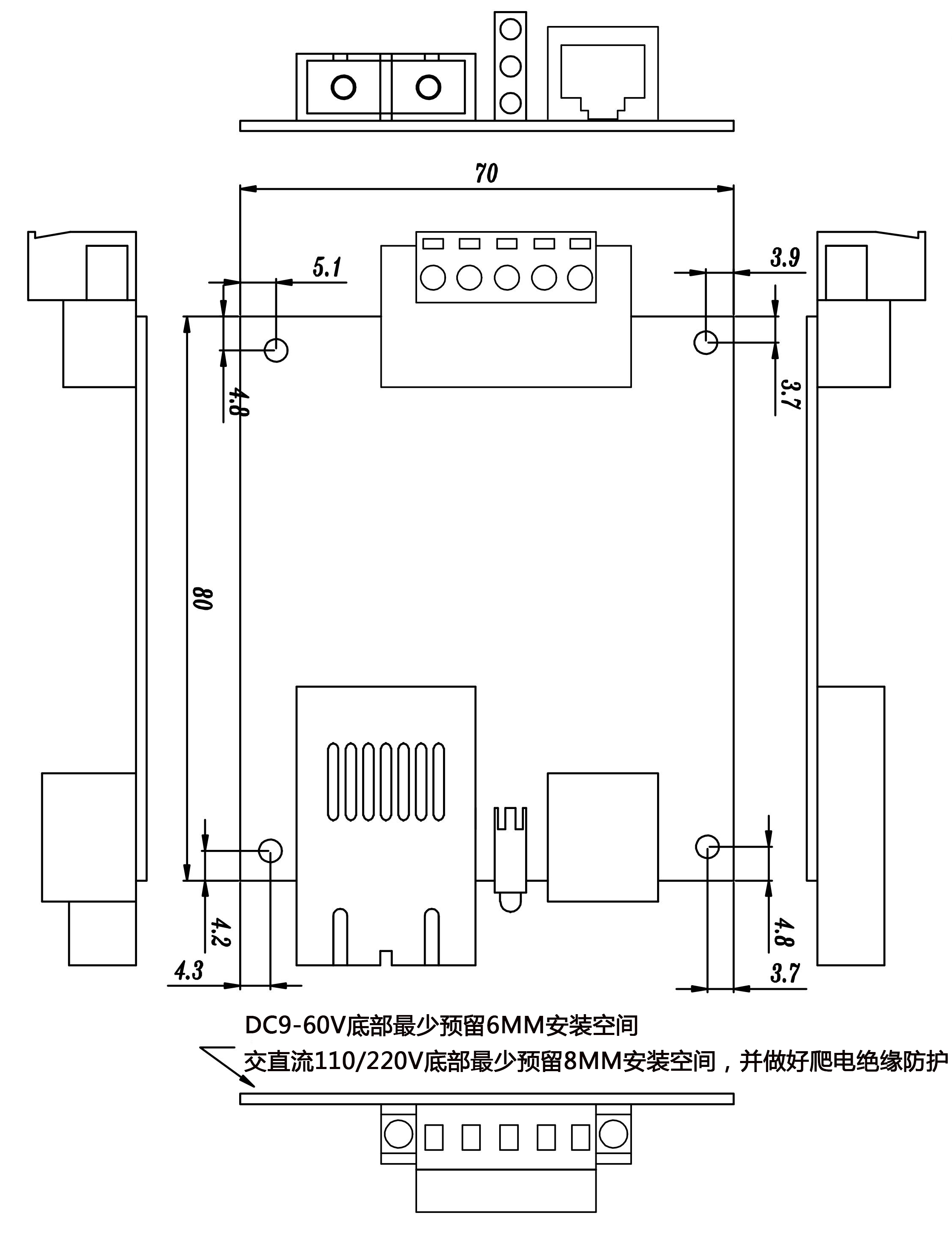 安装方式:嵌入式安装 散热方式:自然冷却,无风扇 外形尺寸:80×70×18(mm)(不含连接器尺寸) |