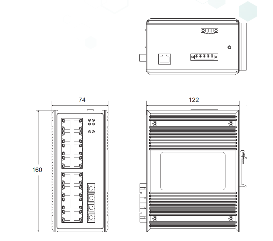 物理尺寸(高×宽×深):160mm×74mm×122mm 安装方式:标准DIN卡轨式 散热形式:铝合金单肋形机箱表面散热,无风机 机壳防护:IP40 |