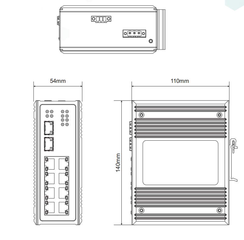 散热方式:铝合金单肋形机箱表面散热,无风机 物理尺寸(长×宽×高):140mm×54mm×110mm(不含DIN卡轨组件) 安装方式:35mm标准DIN导轨式安装 |