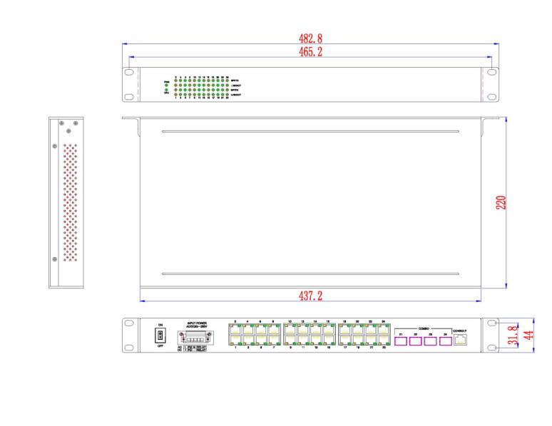 20个10/100/1000M电口,4个1000M SFP扩展槽(combo光电复用接口),支持网管.AC/DC85~265V |